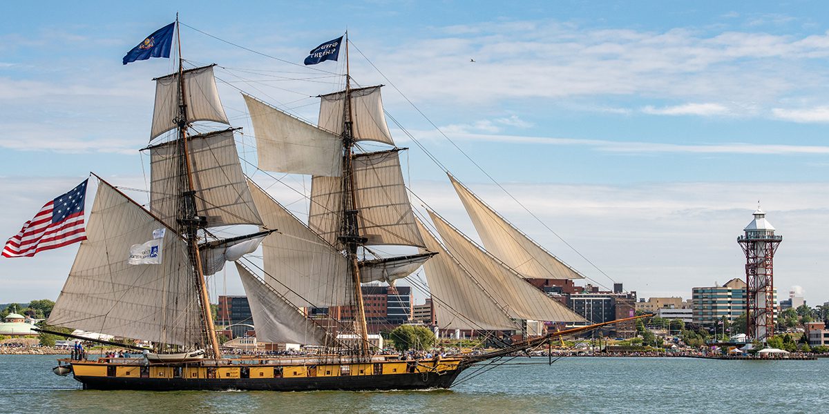 By 1812, when war broke out with the British, Erie County was just getting its footing as a port town. But citizens rallied to the cause and quickly organized a company of minutemen. One citizen, Daniel Dobbins, was even more strategic, and successfully lobbied the U.S. Navy to build the American fleet in Erie’s shipyard. Erie’s docks hummed with activity, turning out gunboats and brigs that proved pivotal in later skirmishes. The brigs Niagara and the Lawrence, which Commodore Oliver Hazard Perry led to victory in the 1813 Battle of Lake Erie, were launched from Dobbins’ shipyards, securing Erie County’s place in the history books. Today, the U.S. Brig Niagara, a wooden-hulled replica of Perry’s flagship, sets sail on Lake Erie and docks in Presque Isle Bay, keeping that maritime history alive in Erie County.