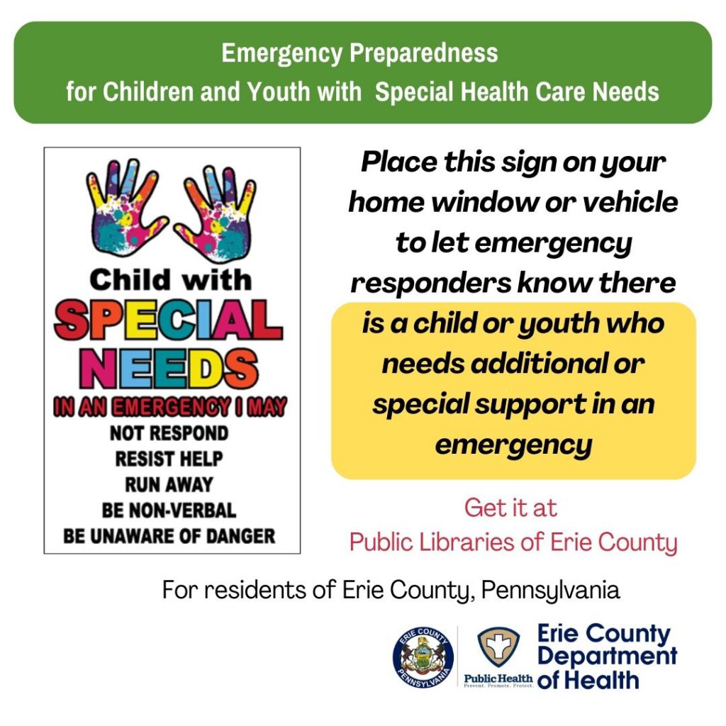 The “Child with Special Needs” signs are available for residents of Erie County, Pennsylvania as